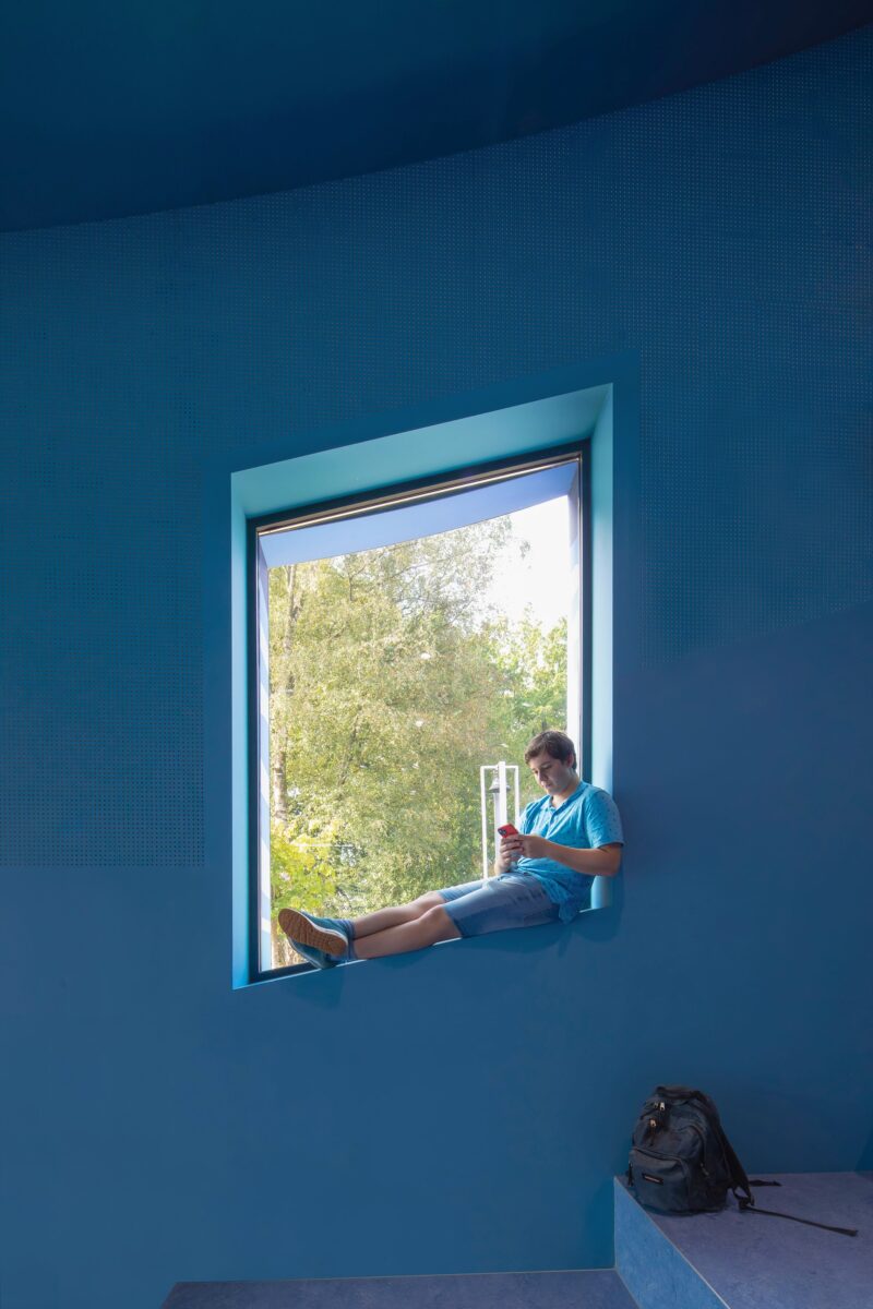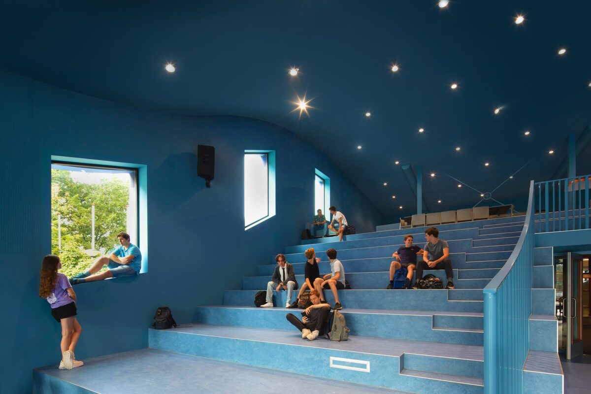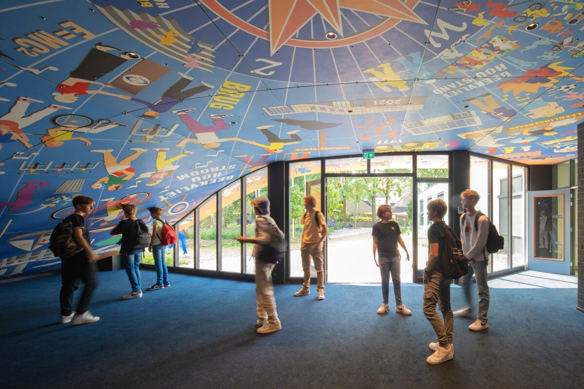 “Je oude school mogen verbouwen is natuurlijk een enorme eer”, zegt Winy Maas, founding partner van MVRDV. “Theobert, Gijs en ik vroegen ons af hoe we dat zo konden doen dat het gymnasium zowel zou inspelen op de hedendaagse context als op het verleden. De schilderijen van Ian helpen daar enorm bij. Ik vind het geweldig dat herinneringen aan studenten uit heden en verleden in zijn muurschilderingen worden weergegeven. Eigenlijk zit in dit gebouw een stukje van iedereen uit het dorp. Het is echt een weerspiegeling van heel Sint-Michielsgestel en omgeving. Alles komt samen in een ‘kompas’ in het plafond van de nieuwe entreehal dat wijst naar waar de verhalen in de omgeving vandaan komen.”