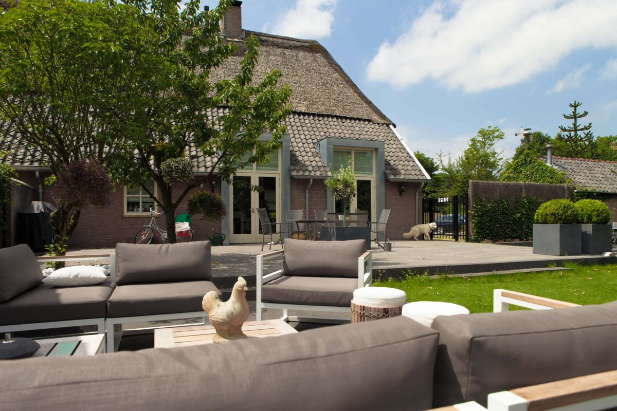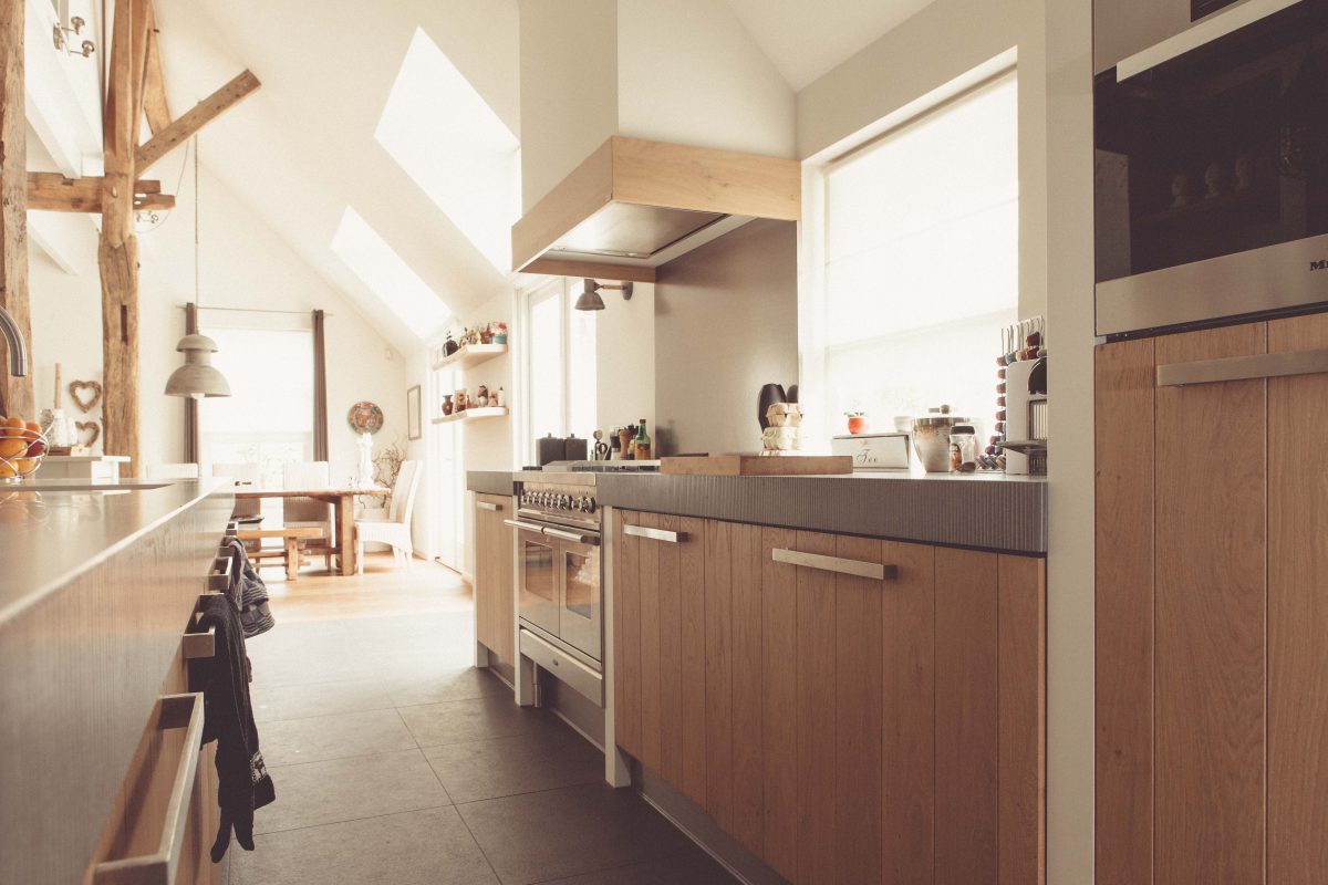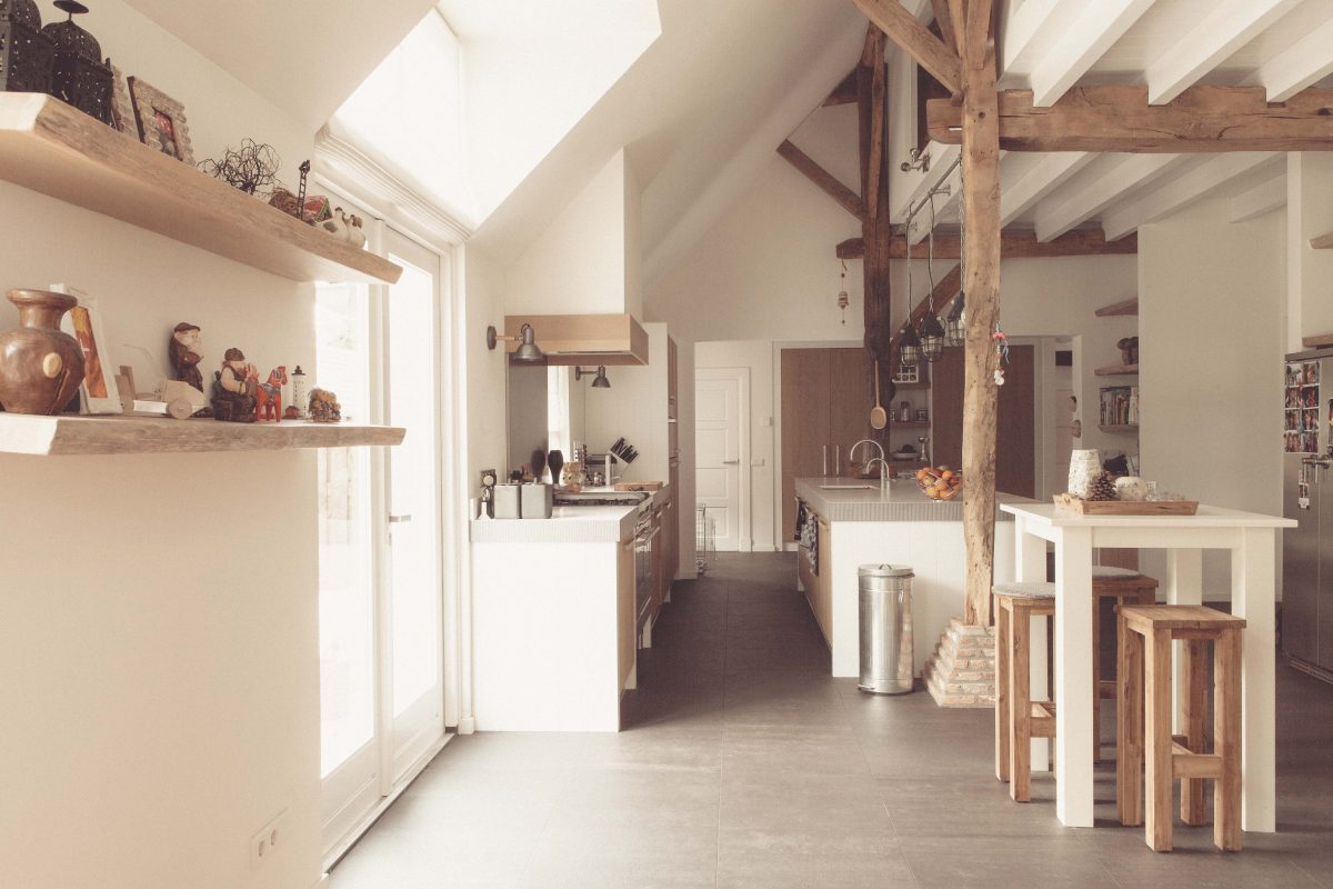 Het nieuwe interieur van de boerderij is even spraakmakend als het exterieur. Zo heeft de keuken een natuurstenen aanrechtblad en houten frontpanelen. Ook geeft de oude houten spant in de keuken samen met de gehandhaafde details een prachtig totaalbeeld van de boerderij.